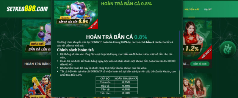- Sự kiện hoàn trả tiền cược bắn cá lên đến 0.85% cho tất cả mọi người chơi.
